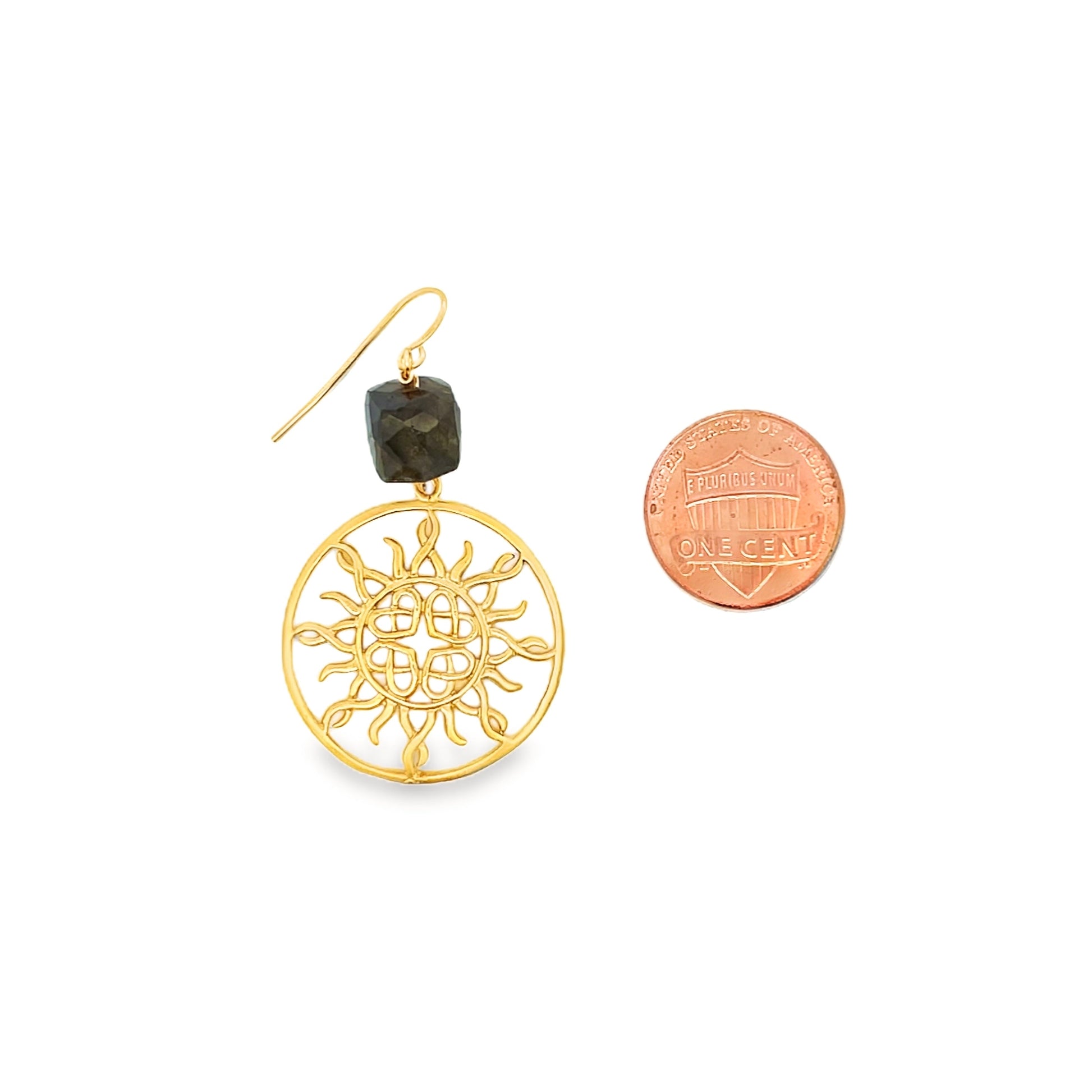 A bold take on a drop earring featuring labradorite and a golden sunburst. Designed to catch the light and add a playful statement to your everyday look.